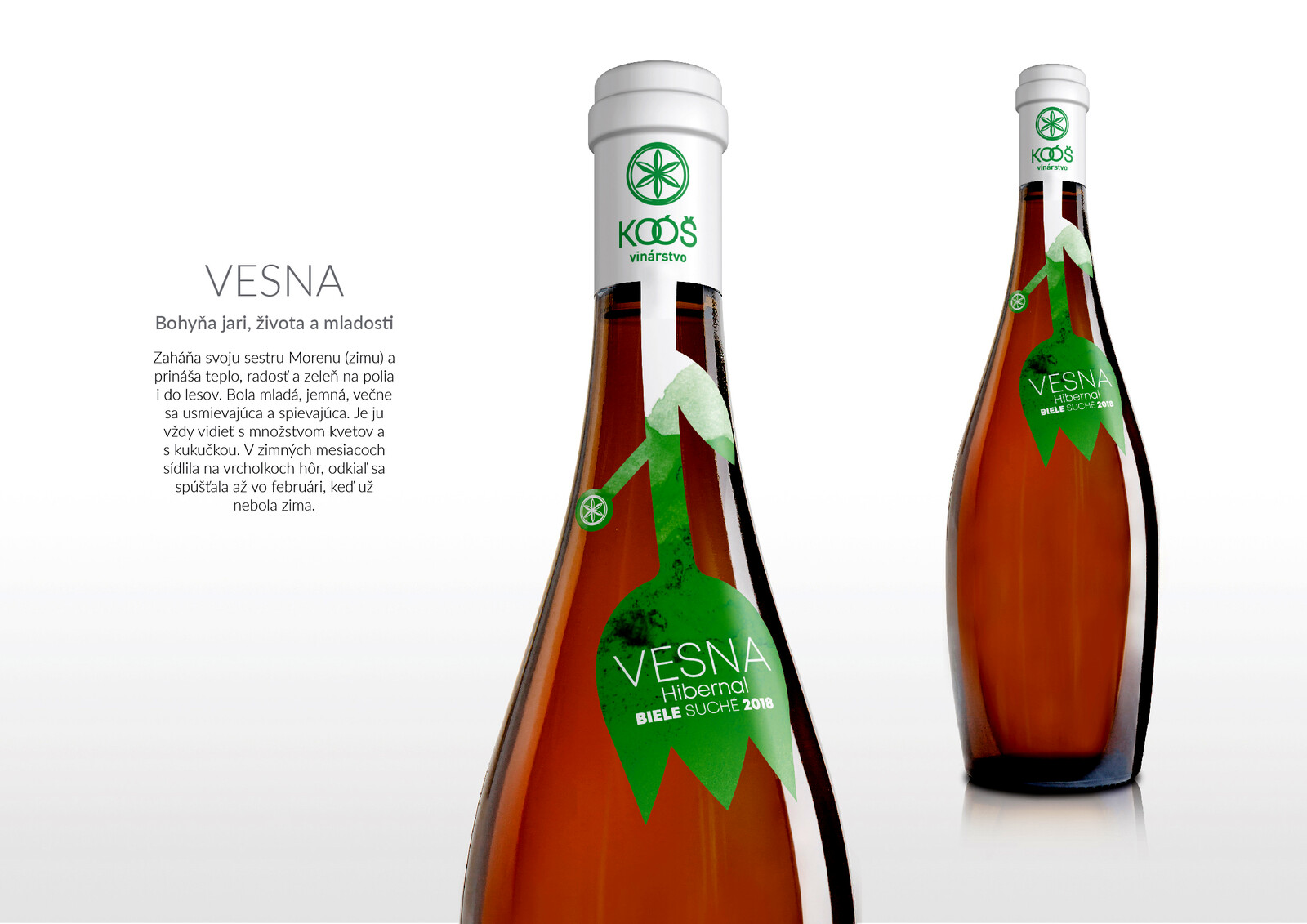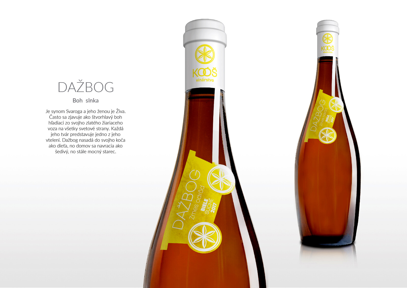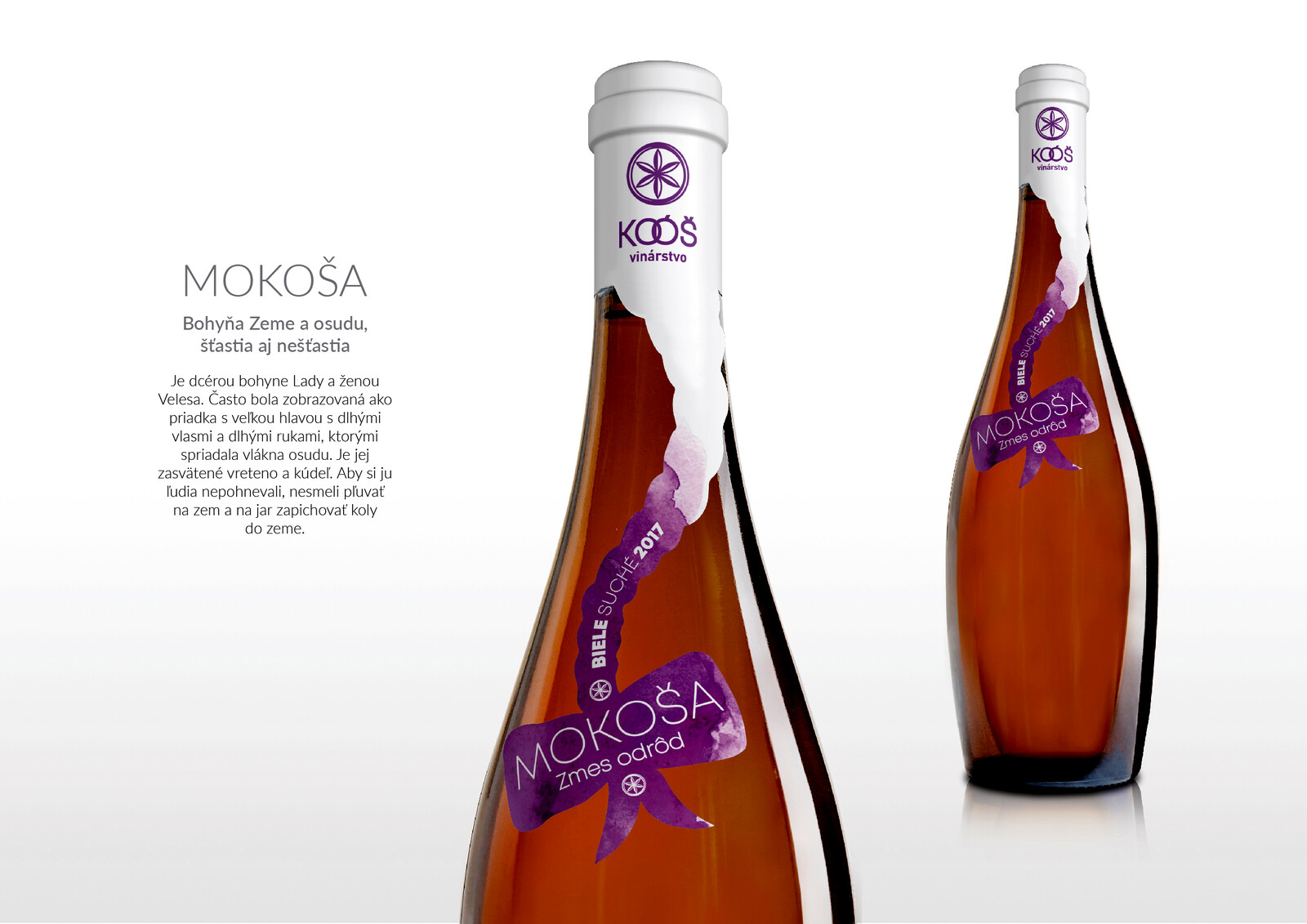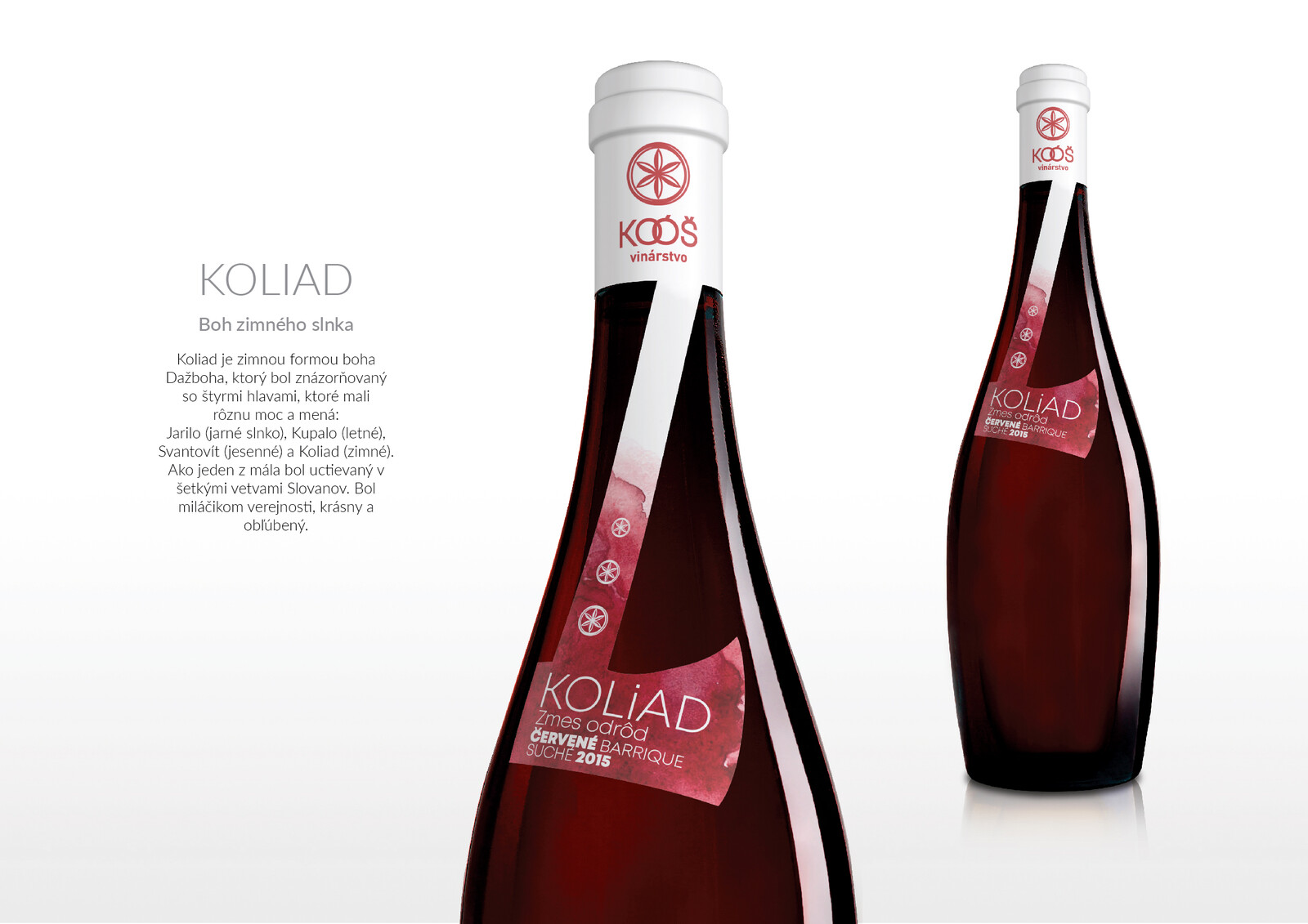 Malé rodinné Vinárstvo KOÓŠ sa nachádza v regióne tradičného staroslovanského osídlenia. Práve tieto charakteristiky – rodina, remeslo a tradície - sú podstatou návrhu logotypu, firemnej identity a celého radu vínnych etikiet, ktorý sa opiera o pestrú slovanskú mytológiu. Logotyp bol išpirovaný svargou, staroslovanským symbolom rodiny a viery. Finálne prevedenie logotypu odkazuje na ručné remeslá, zvyky a tradície, ktoré prežili až do súčasnosti. Aj napriek tradičným išpiráciám logotyp a korporátna identita má pôsobiť progresívne. Samotná kolekcia etikiet vychádza zo symbolov a vlastností jednotlivých slovanských bohov. Aplikácia etikiet je osadená zámerne na vrchnej časti fľaše z dôvodu výrazného tvarovania a aby súčasne vynikla krása tvaru fľaše samotnej.