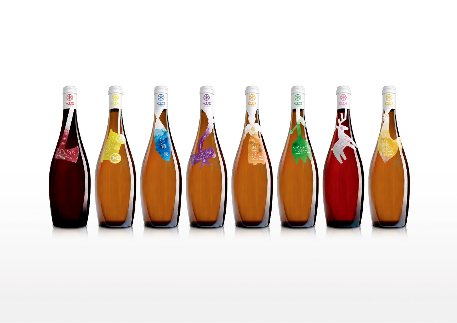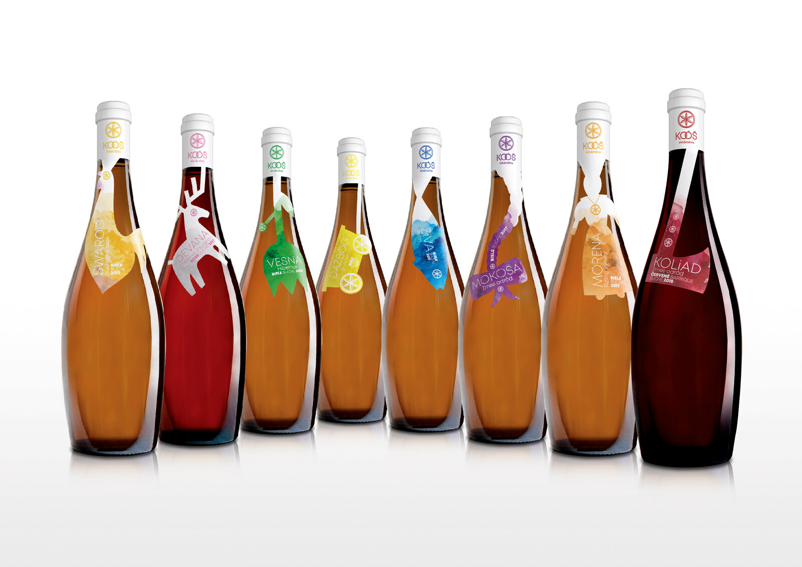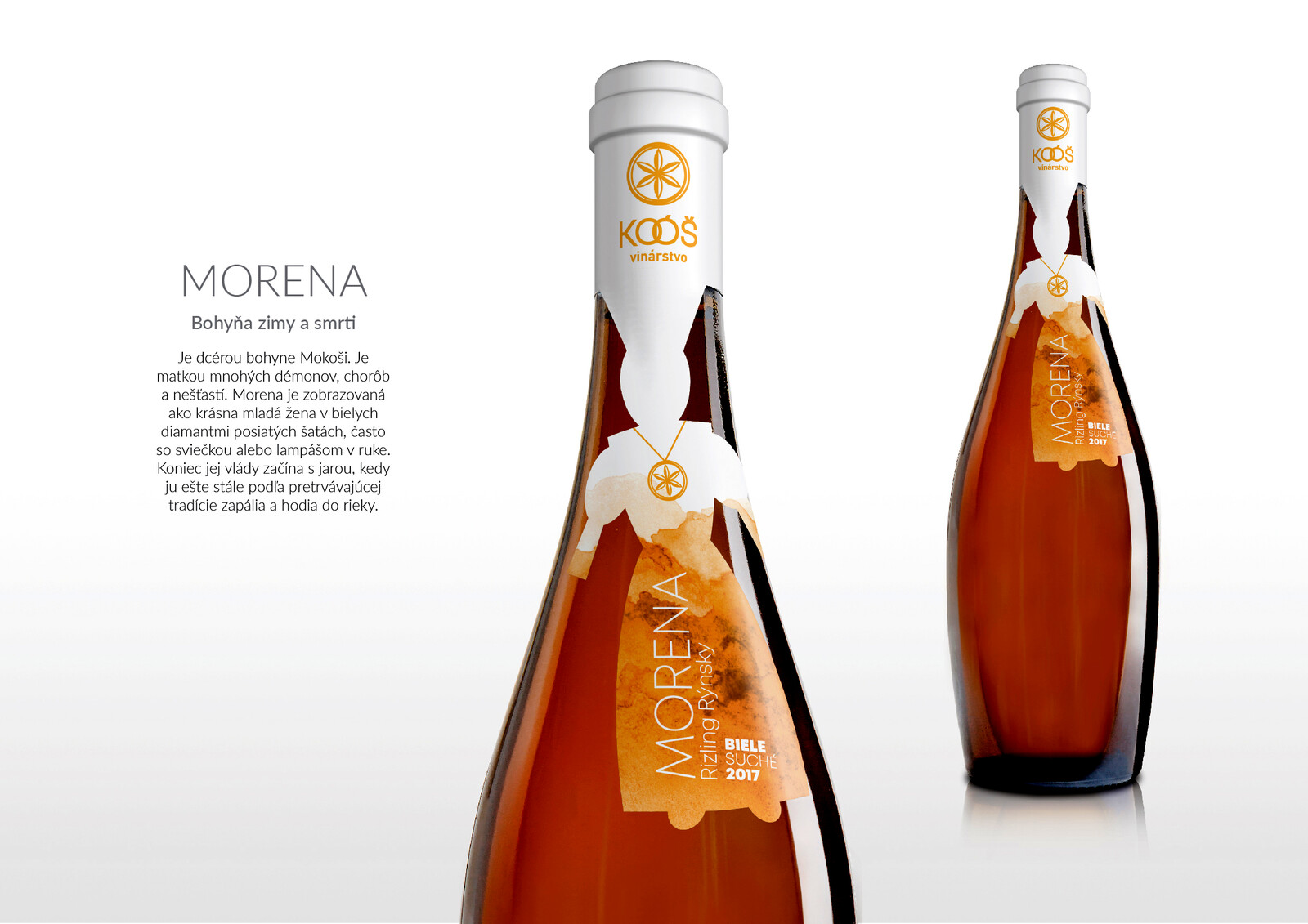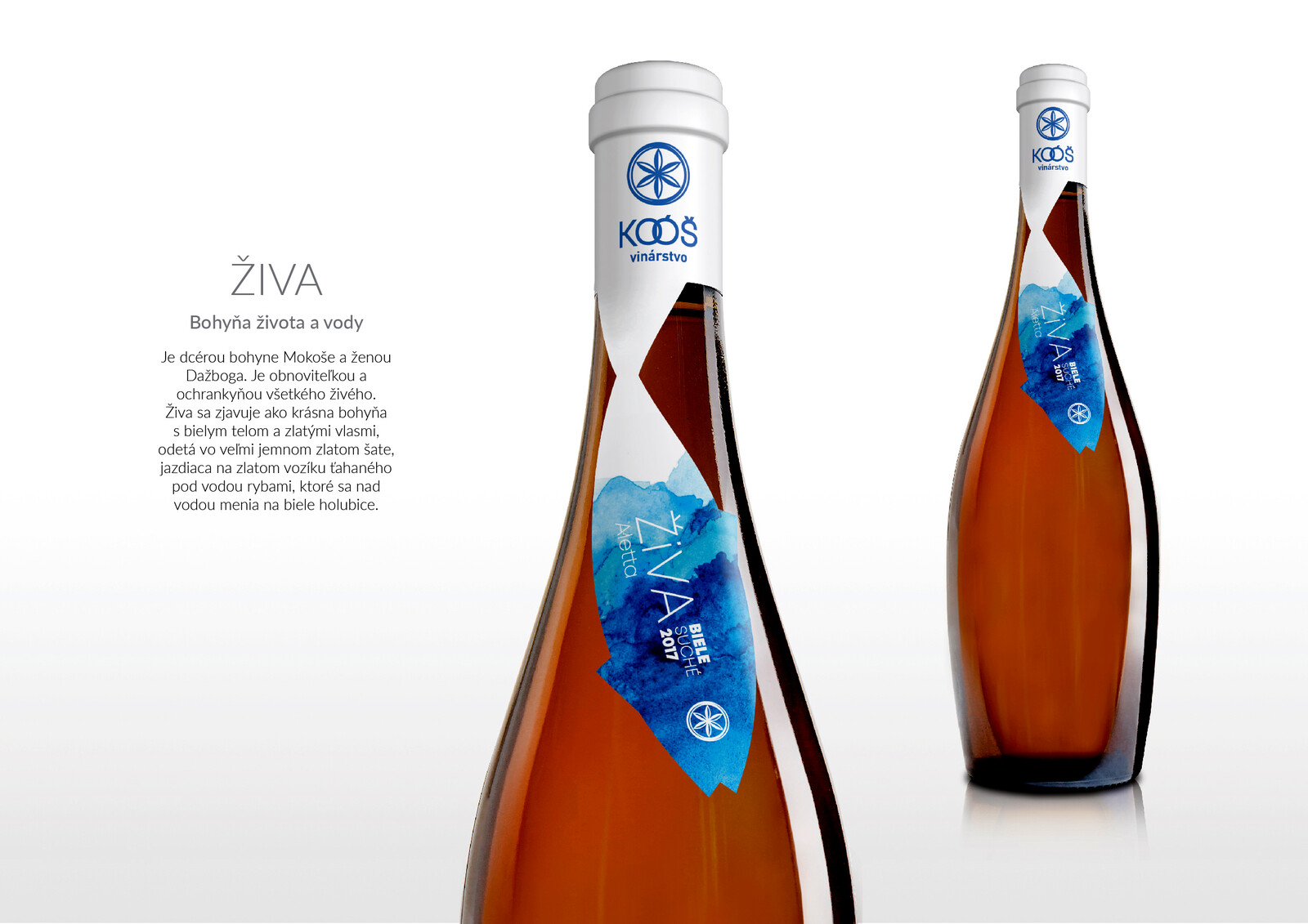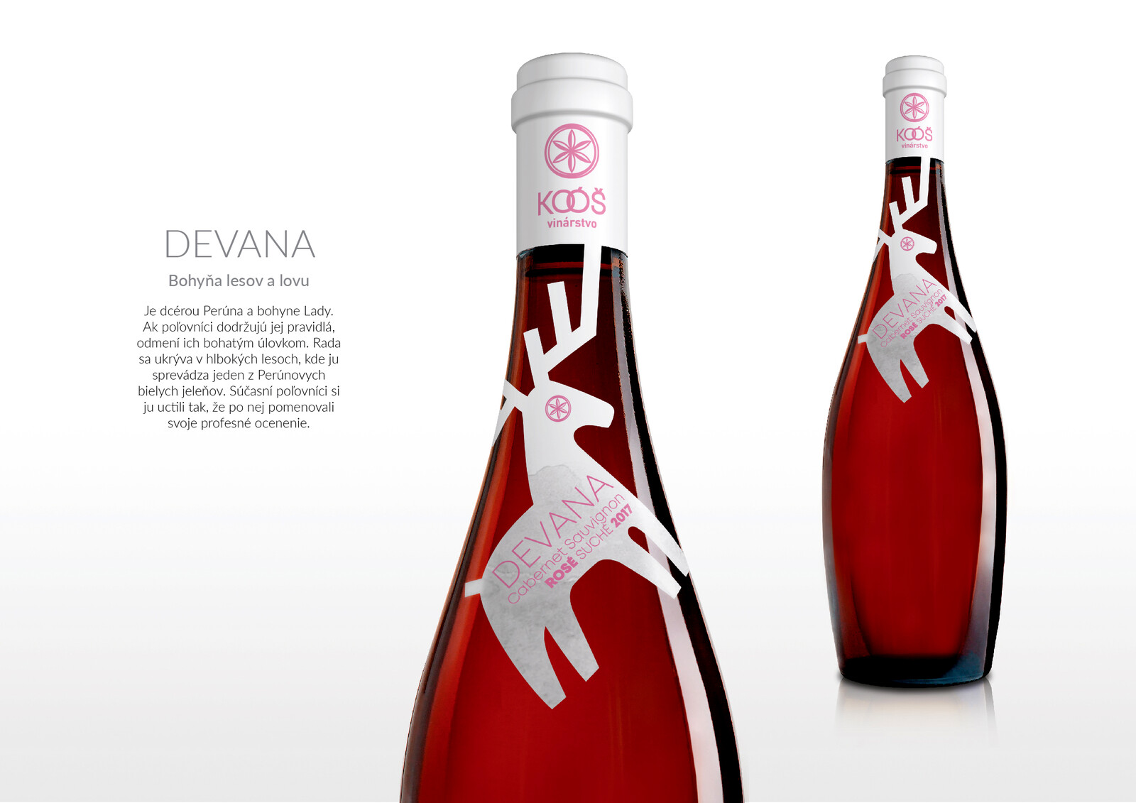 Malé rodinné Vinárstvo KOÓŠ sa nachádza v regióne tradičného staroslovanského osídlenia. Práve tieto charakteristiky – rodina, remeslo a tradície - sú podstatou návrhu logotypu, firemnej identity a celého radu vínnych etikiet, ktorý sa opiera o pestrú slovanskú mytológiu. Logotyp bol išpirovaný svargou, staroslovanským symbolom rodiny a viery. Finálne prevedenie logotypu odkazuje na ručné remeslá, zvyky a tradície, ktoré prežili až do súčasnosti. Aj napriek tradičným išpiráciám logotyp a korporátna identita má pôsobiť progresívne. Samotná kolekcia etikiet vychádza zo symbolov a vlastností jednotlivých slovanských bohov. Aplikácia etikiet je osadená zámerne na vrchnej časti fľaše z dôvodu výrazného tvarovania a aby súčasne vynikla krása tvaru fľaše samotnej.